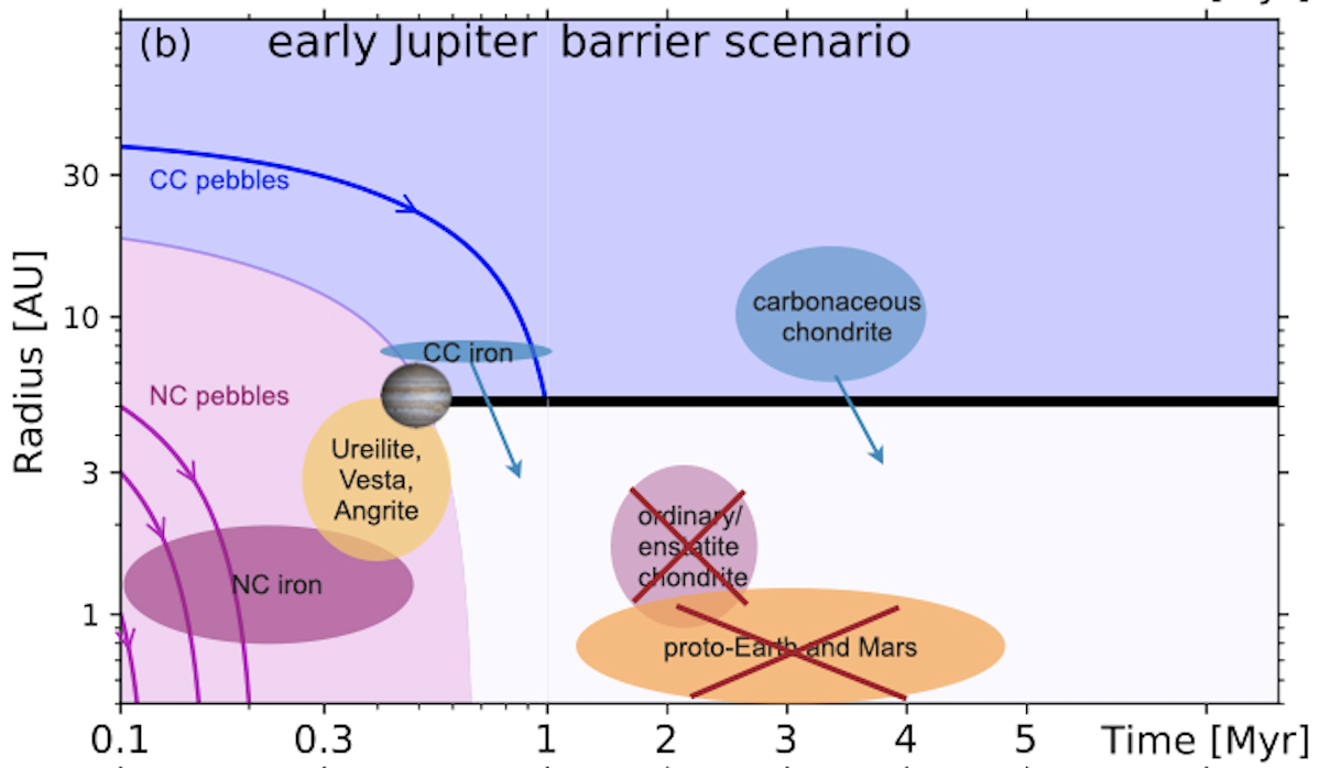 Figure 2: Cartoon illustrating that the early Jupiter formation model cannot explain the NC-CC dichotomy.Â