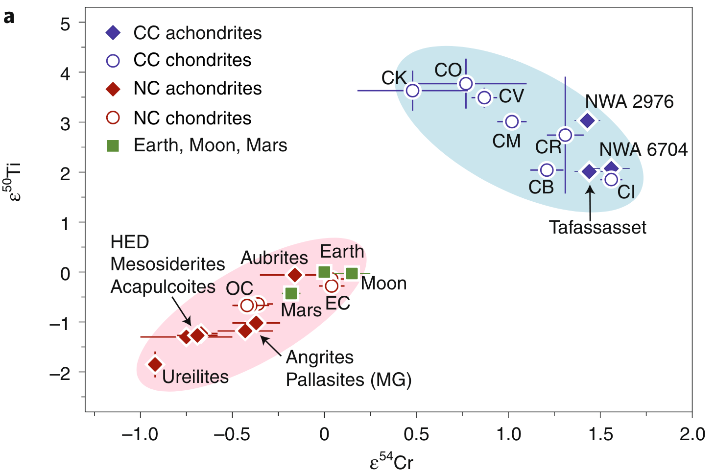 Figure 1: Â dichotomy in the isotopic composition of Ti and Cr between NC (red) and CC (blue) meteorite groups.Â