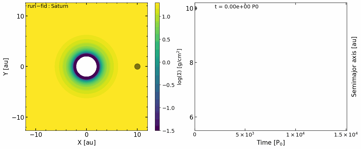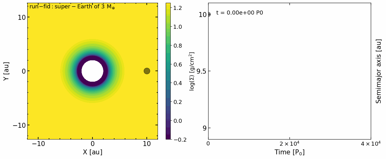 We have conducted 2D hydrodynamical simulations of planet-disk interaction for various planet masses and disk properties. The following movies show planets with various masses (e.g., super-Earth of 5 Mearth and Jupiter) rebound outward with the expanding photoevaporative cavity.  Our simulations demonstrate that planets up to about Neptune masses experience a strong positive corotation torque along the cavity edge that leads to sustained outward migration -- a phenomenon previously termed rebound migration. Jupiter-mass planets are found to undergo modest outward migration as they cause the residual disk to become eccentric.  . See details for Liu et al. 2025, A&A [ADS] [arxiv].