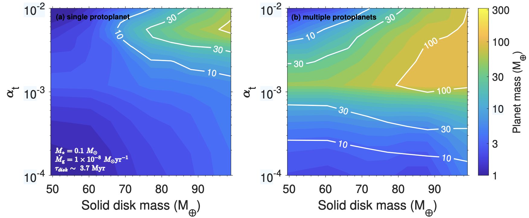Fig.1: solid disk mass vs turbulent viscosity for giant planet formation starting from single vs multiple protoplanet growth.Â