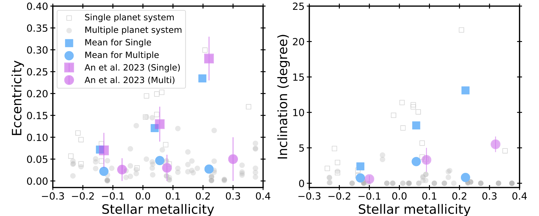 Fig.3: Eccentricity and mutual inclination vs system's multiplicity and host star's metallicity. Simulation results are corrected for transiting bias while comparing with An et al. 2023's observational data.Â